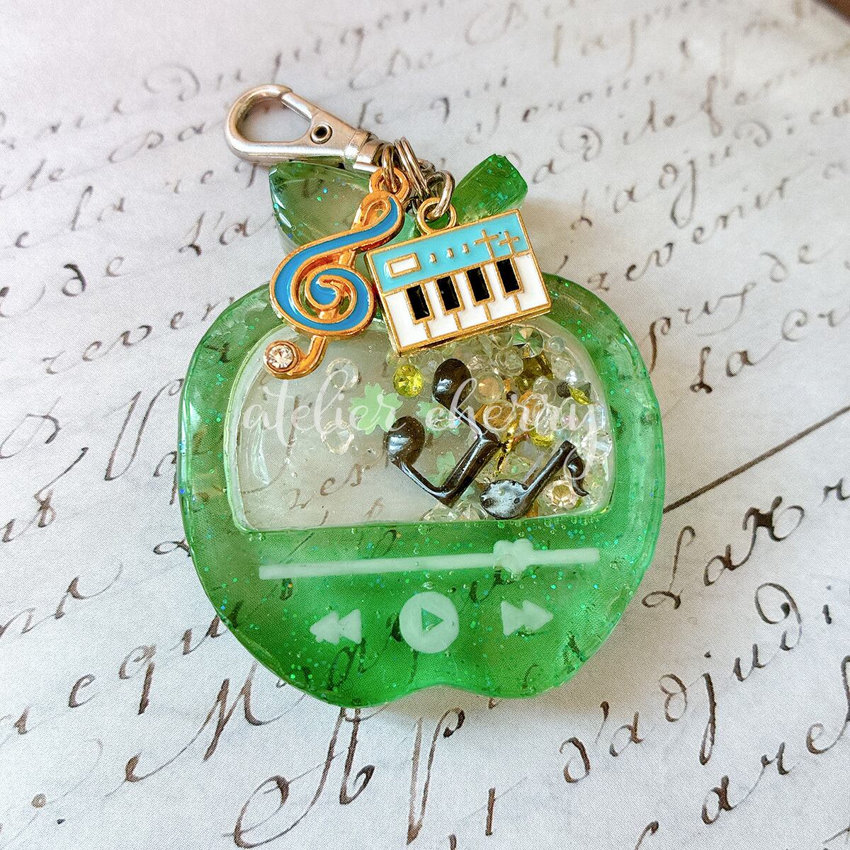 まるで小さな音楽プレーヤーのような、りんご型のレジンチャームです。