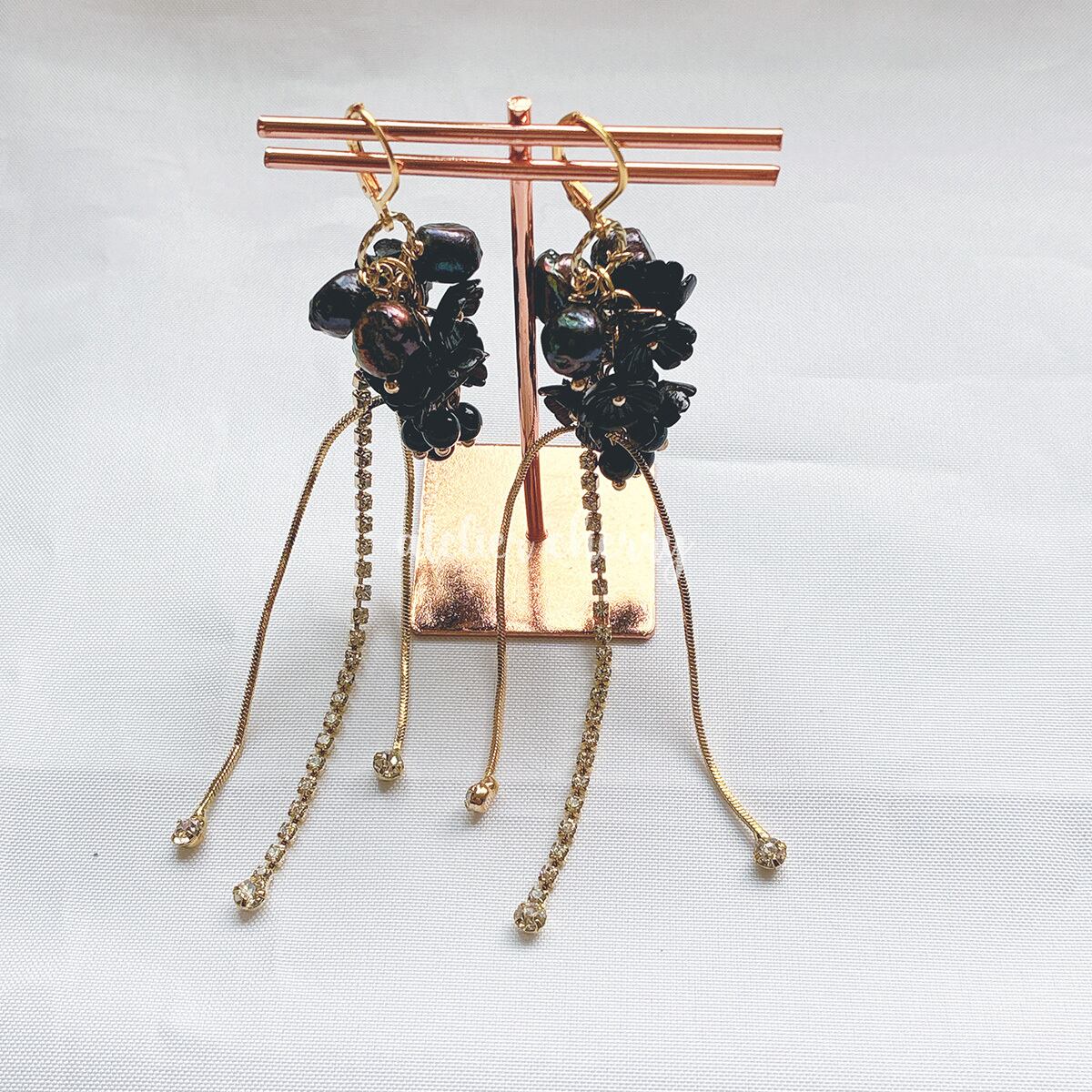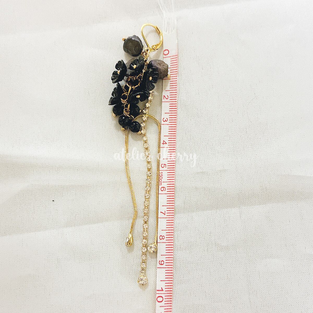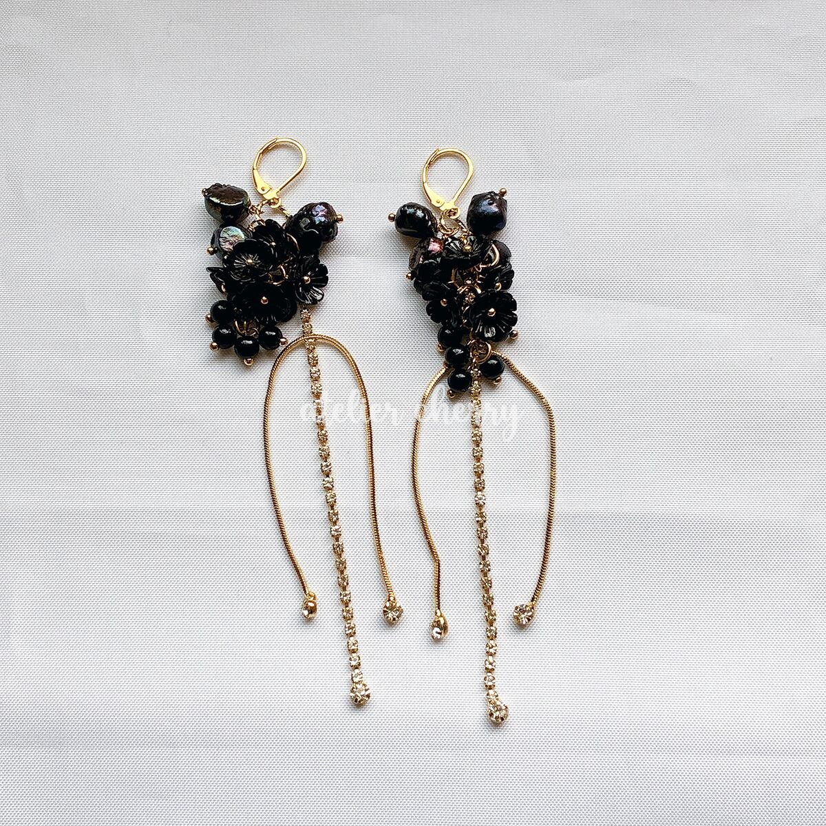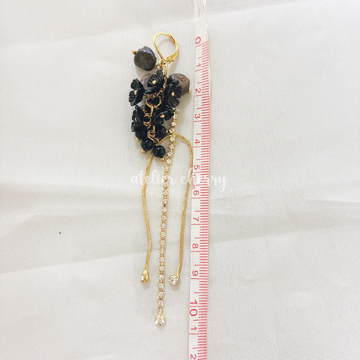 トップには黒い花型ビーズや天然シェル風パール、ガラスビーズをたっぷりとあしらい、動くたびに上品に揺れるデザイン。