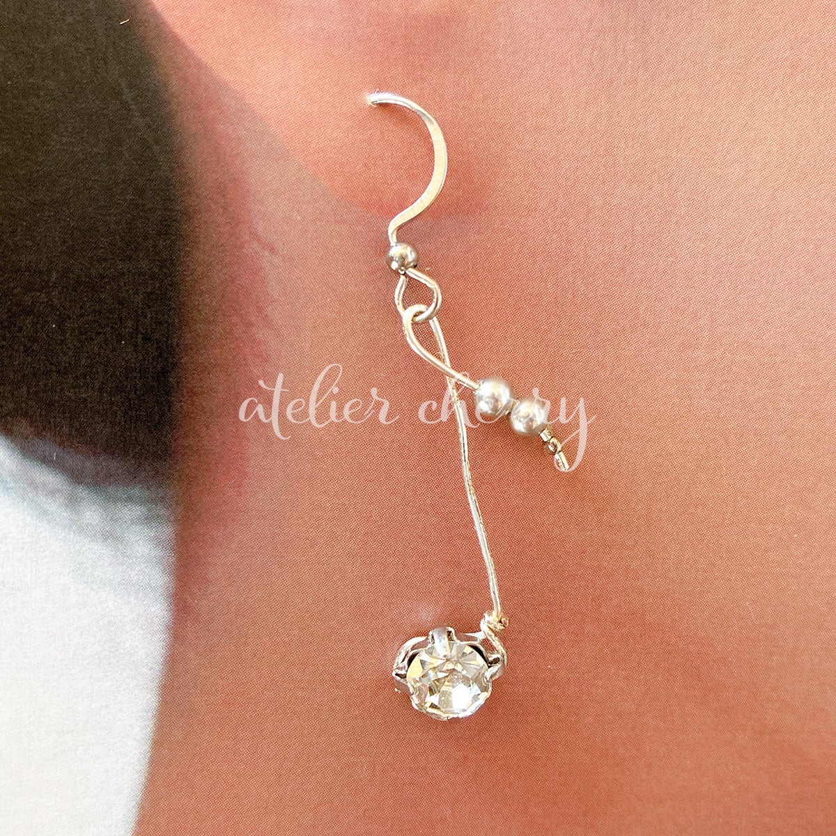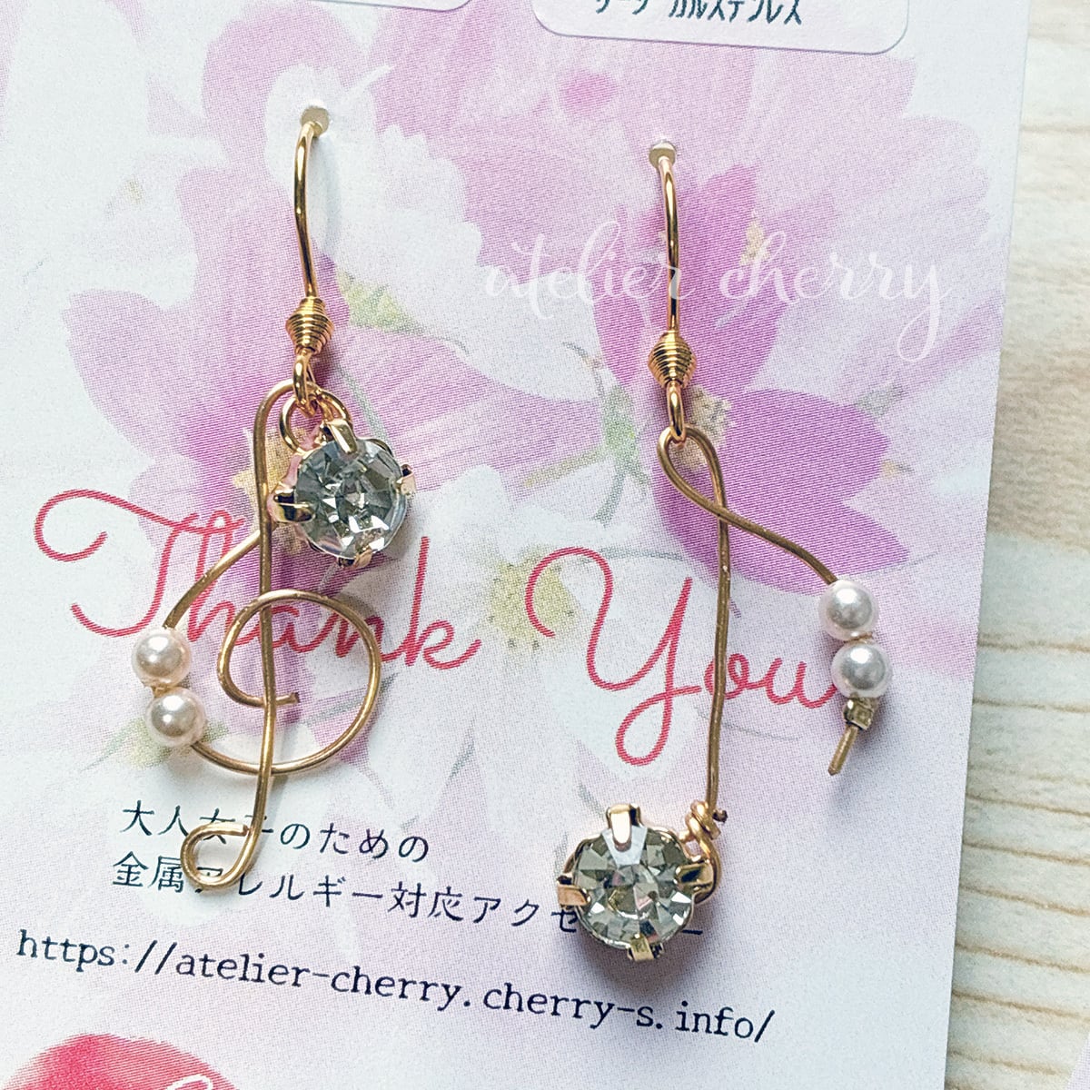 細いワイヤーを1つずつ手作業で曲げてつくったト音記号と♪のモチーフは、少しずつ形が違う“自分だけのデザイン”。ガラスパールやラインストーンがきらっと光って、耳元を明るく見せてくれます。
