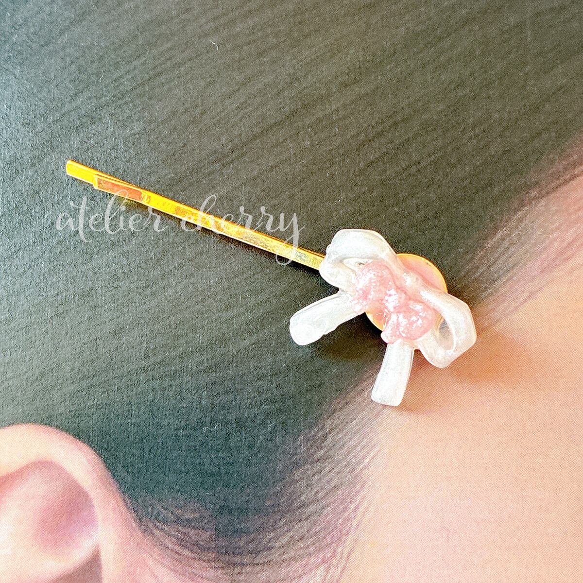 淡いラメがきらっと光る、レジン製のリボンヘアピン2本セット。