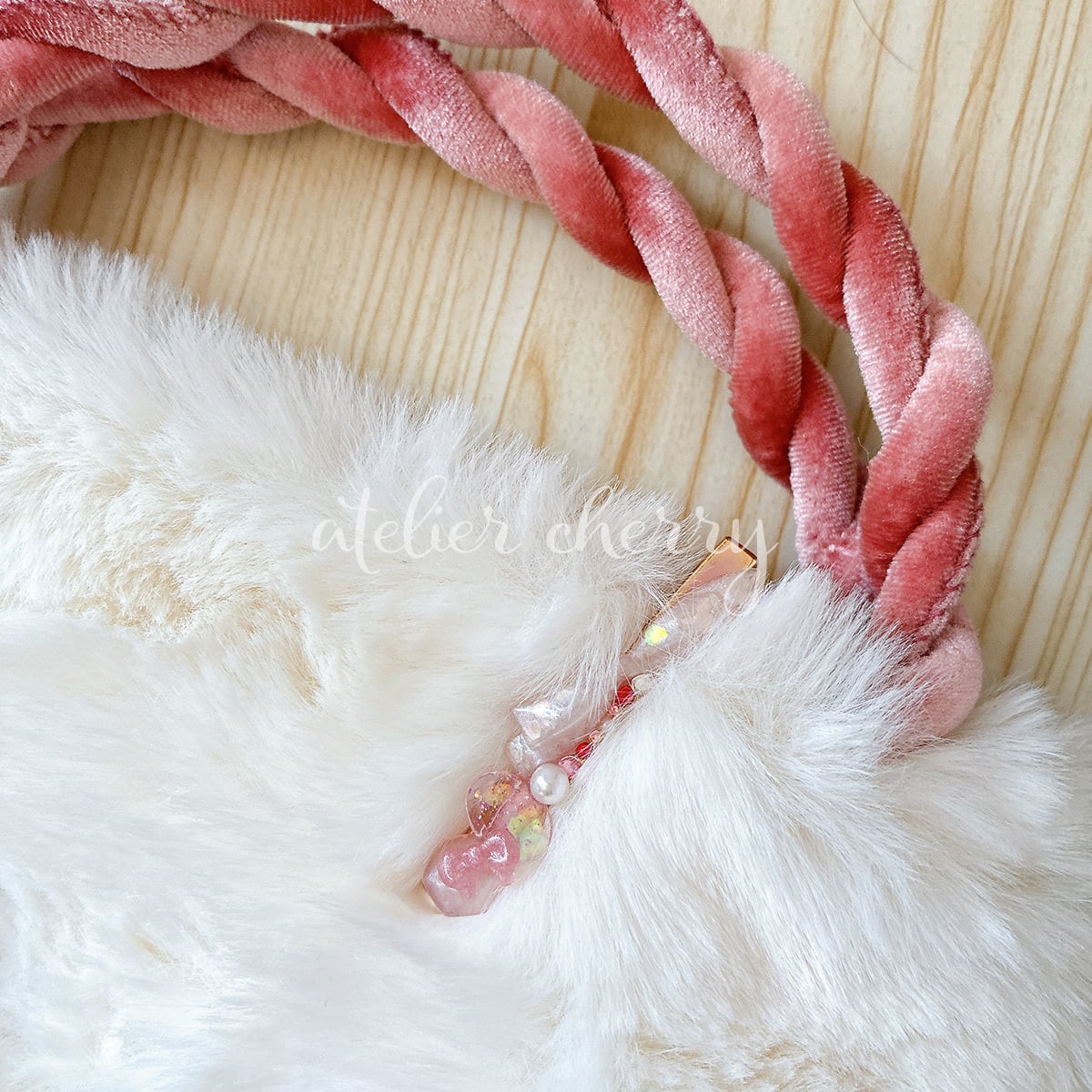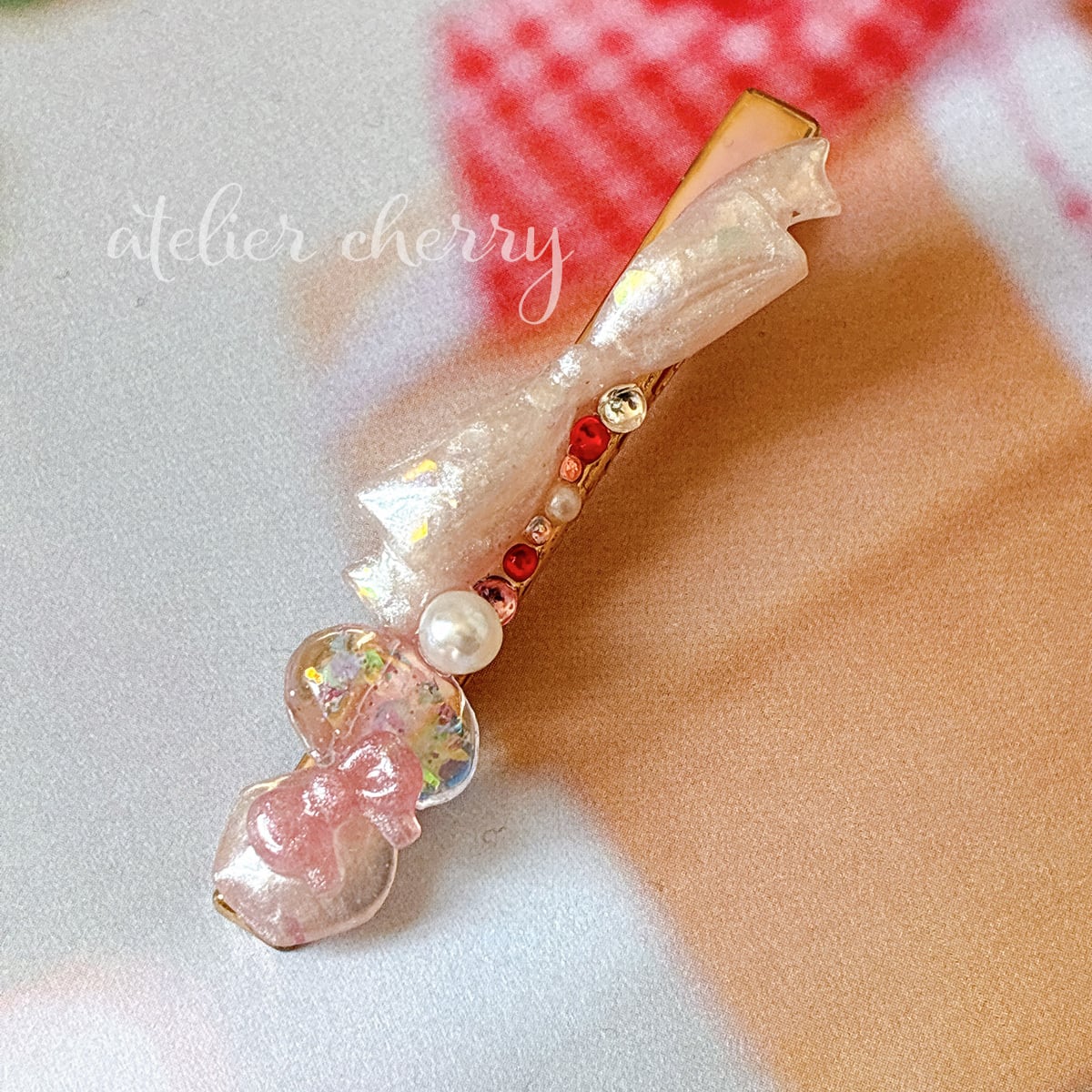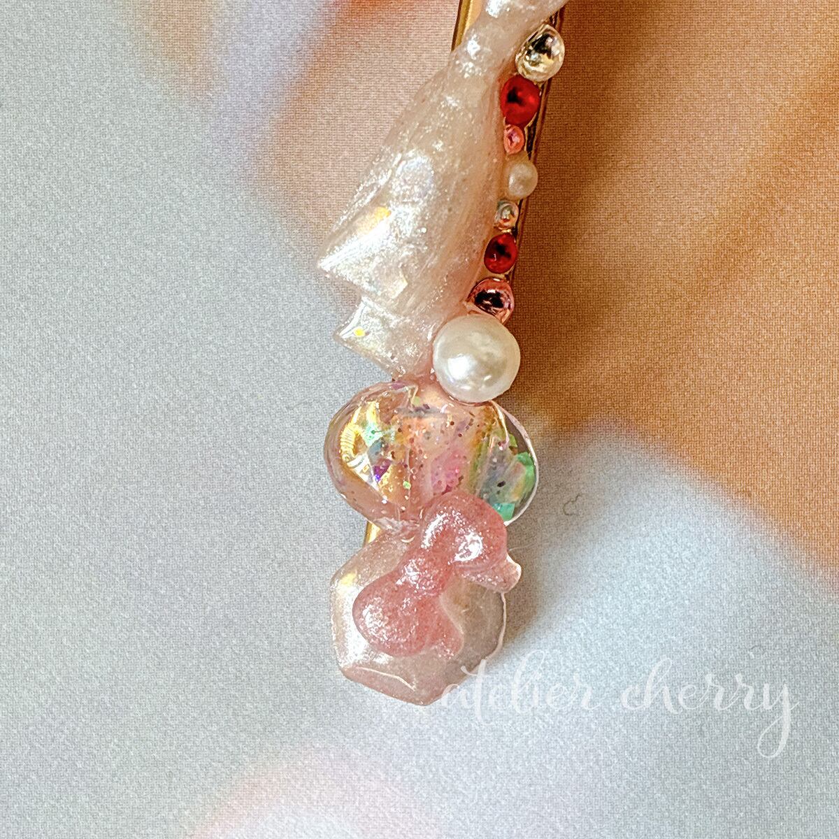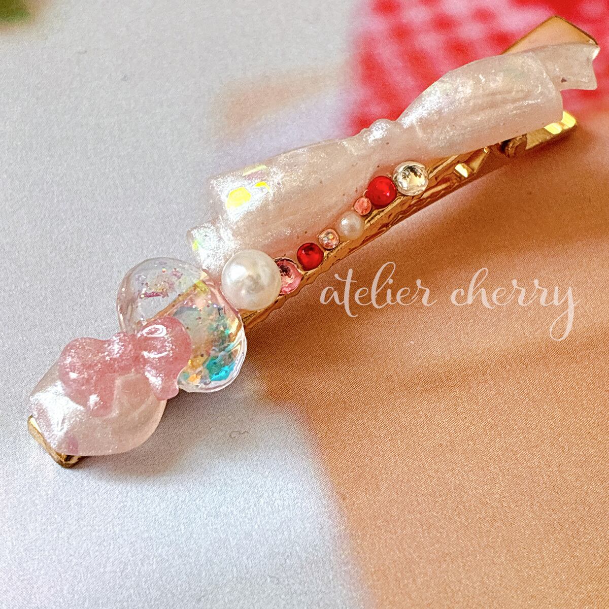 淡いピンクのレジンで仕上げたリボンに、パールやストーンを散りばめた華やかなヘアクリップ。