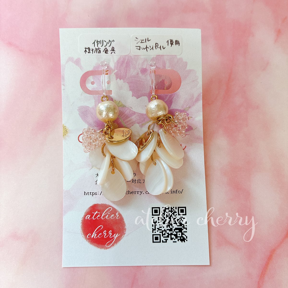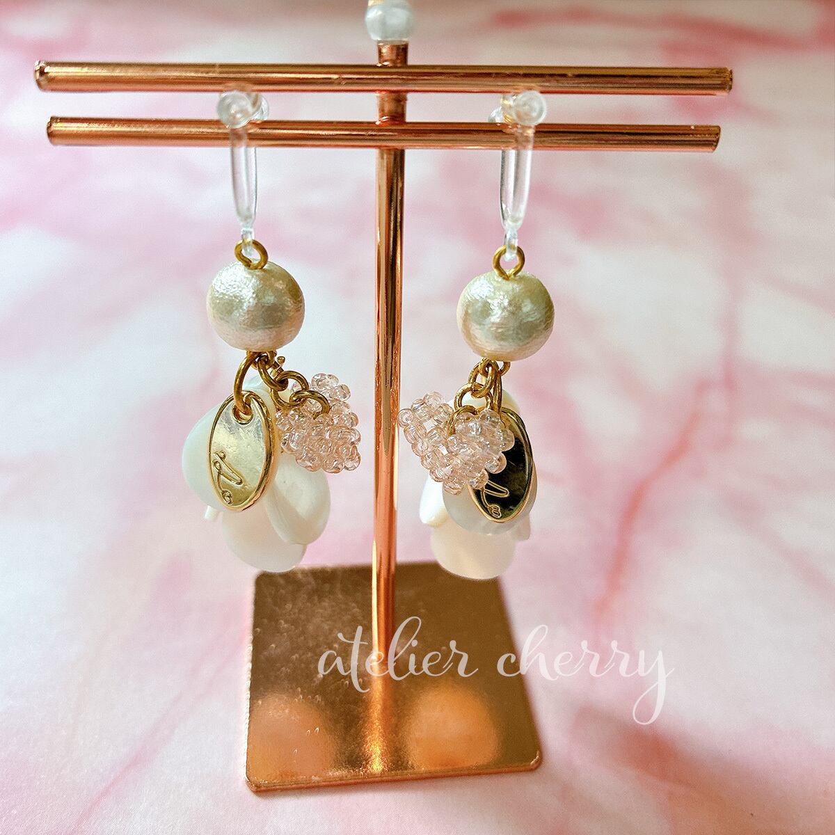 白シェルが花びらのように揺れ、耳元をふんわりと明るく見せてくれる大人きれいめイヤリングです。