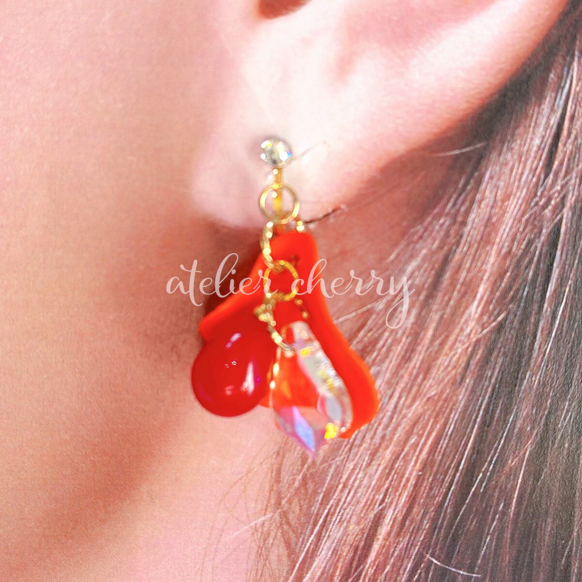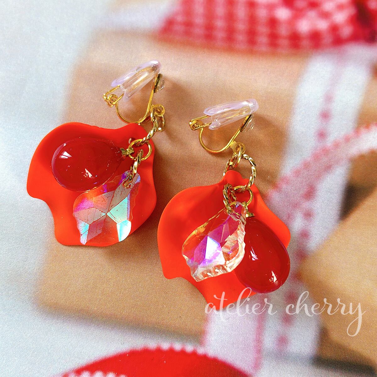 花びらパーツに、赤いビーズとオーロラガラスを丁寧に組み合わせ、軽やかに揺れるデザインに仕上げました。